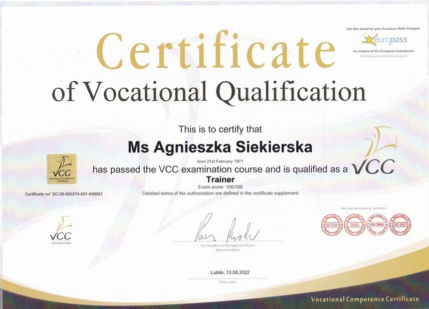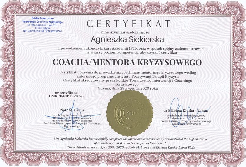Poszłam dalej i zostałam Certyfikowanym trenerem VCC i Transformacji oraz Akredytowanym przez Polskie Towarzystwo Coachingu i Interwencji Kryzysowej Coachem/Mentorem Kryzysowym.