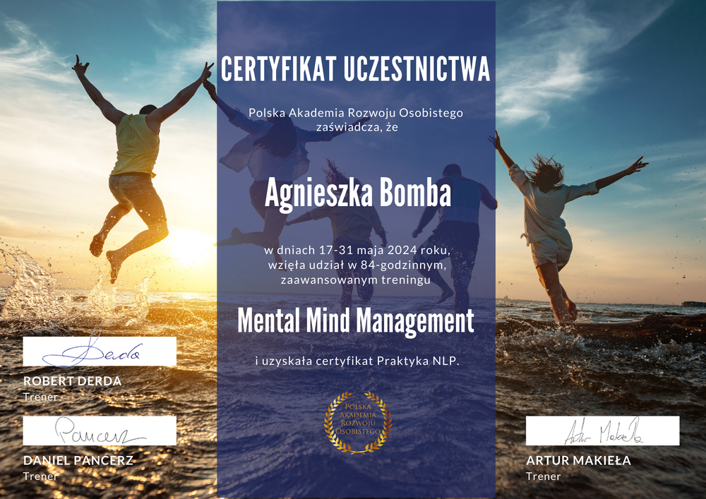 Praca z ludźmi, trudne doświadczenia zmotywowały mnie do ukończenia studiów w zakresie coachingu, zdobycia Certyfikatu Coacha ICI i PRACTITIONER IN THE ART OF NLP.